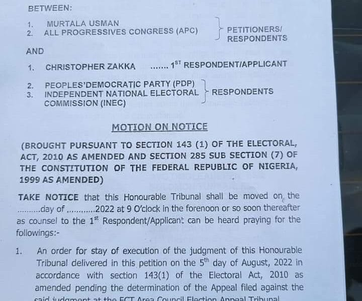 The Area Council Election Tribunal in the election to the office of the Chairman, Abuja Municipal Area Council, Federal Capital Territory has ordered a Stay of...