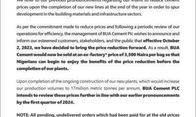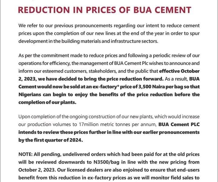 A bag of BUA cement will sell at N3500 from Monday, October 1, 2023. The company disclosed this in a statement on Sunday. The company in...