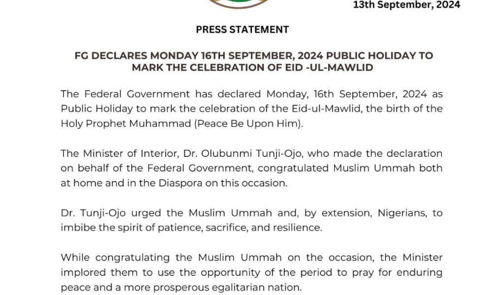 The Federal Government has announced Monday, September 16, 2024, as public holiday to commemorate the birth of the Holy Prophet Muhammad. Minister of Interior, Olubunmi Tunji-Ojo,...